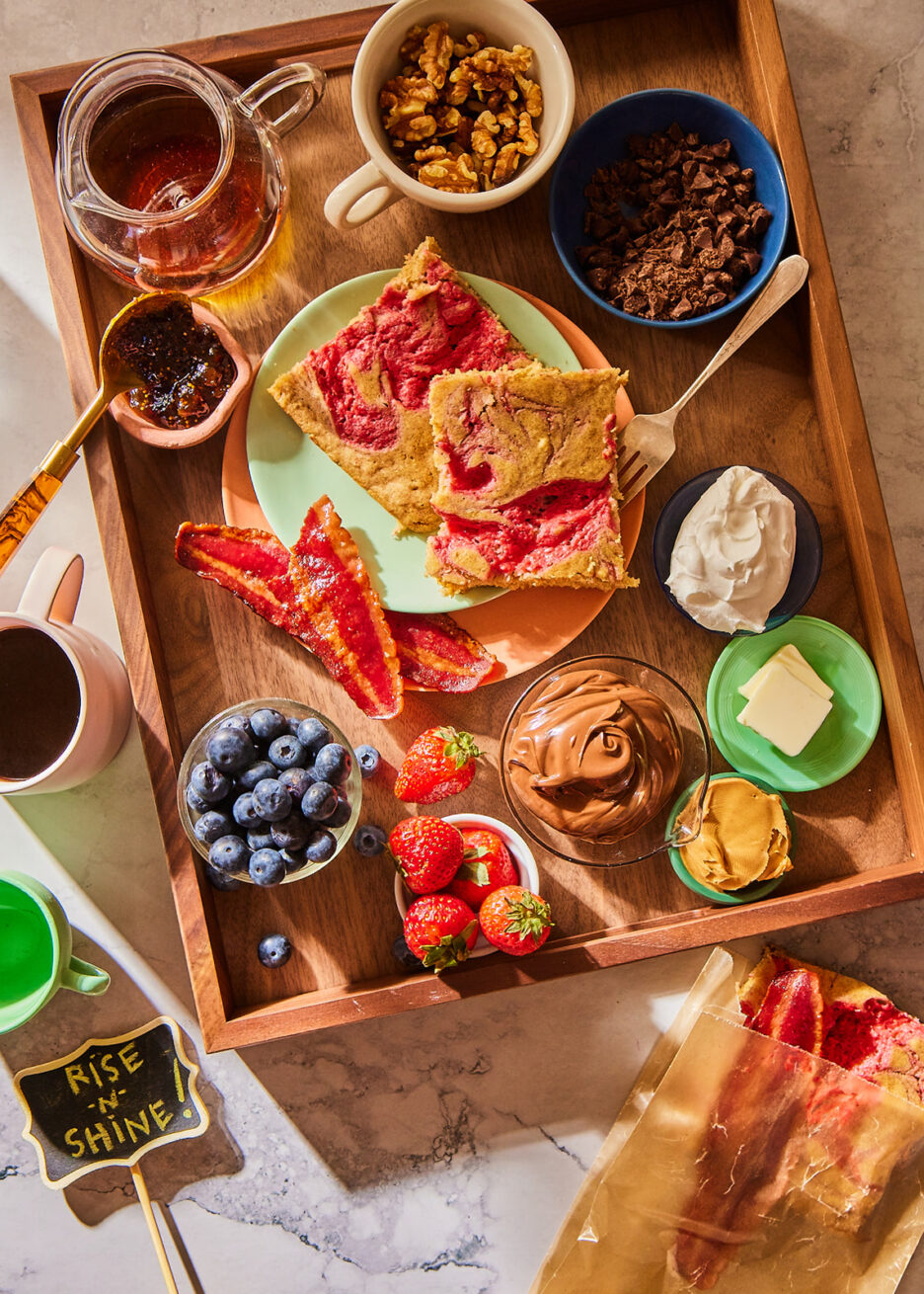 5. In a blender, combine the berries with the lemon juice and blend until smooth. Evenly space dollops of the puree onto the pancake mixture (make 5 rows of 3 dollops). Starting in the upper right corner of the pan, use a toothpick to drag the puree through the mixture in an “S” pattern.